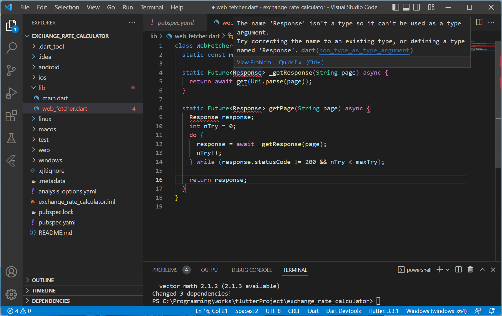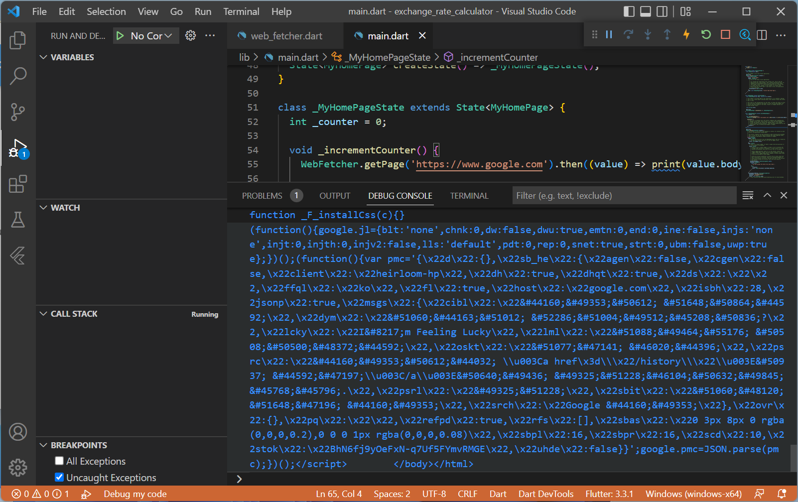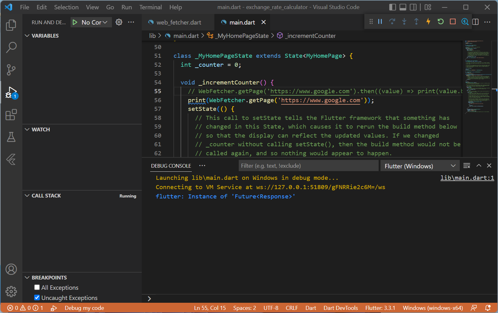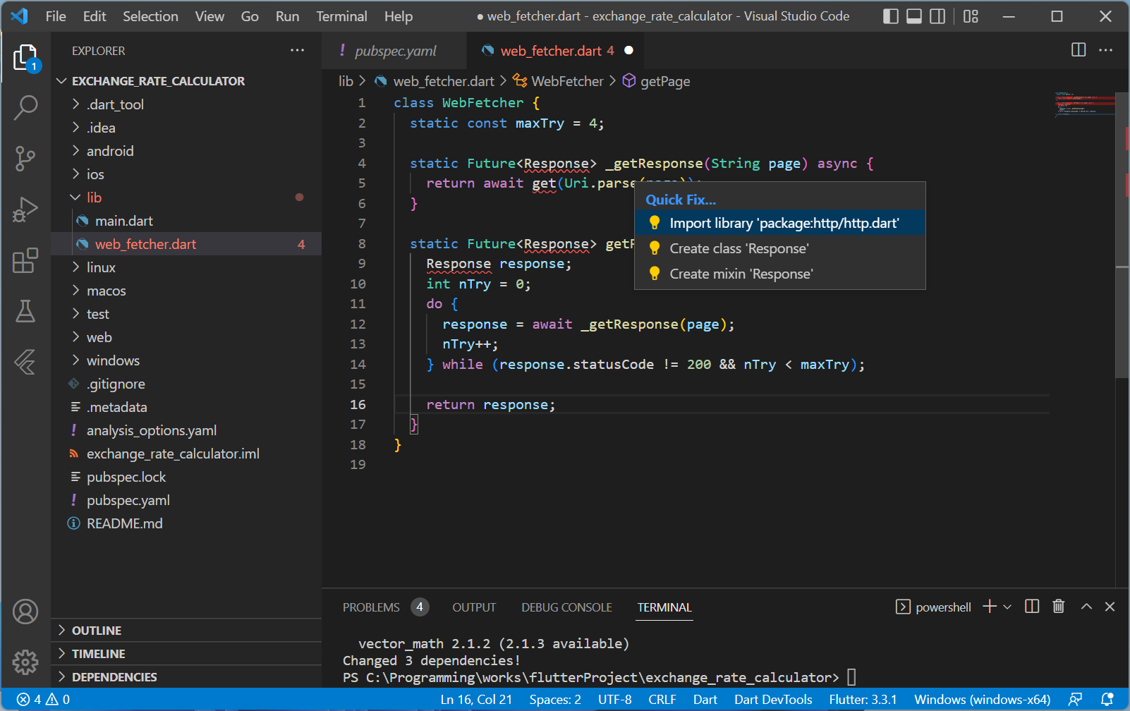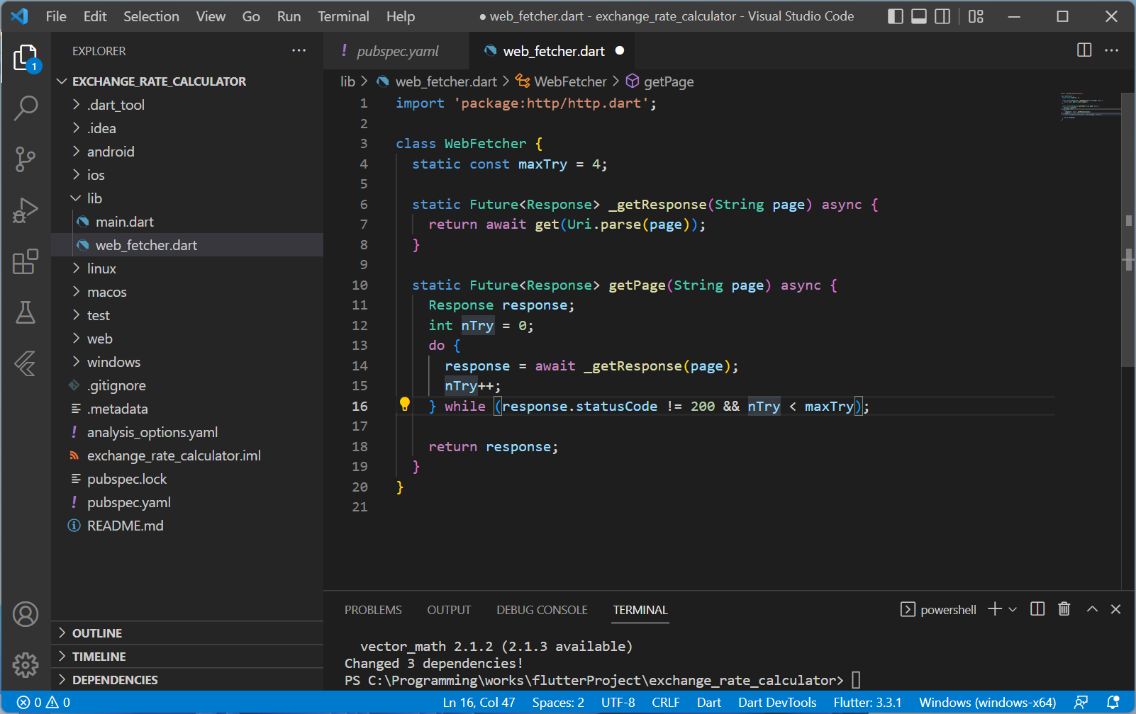 실제 코드가 잘 동작하는지 봐야겠죠. 위에 올린 코드 블럭을 Copy해서 아까 생성한 web_fetcher.dart에 Paste해줍니다.