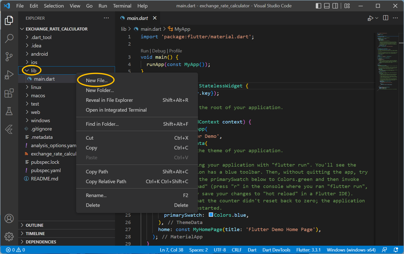 Explorer창(파일 폴더 구조가 보이는 좌측의 창)에서 \lib 폴더를 우클릭하고 New File... 을 클릭해줍니다.