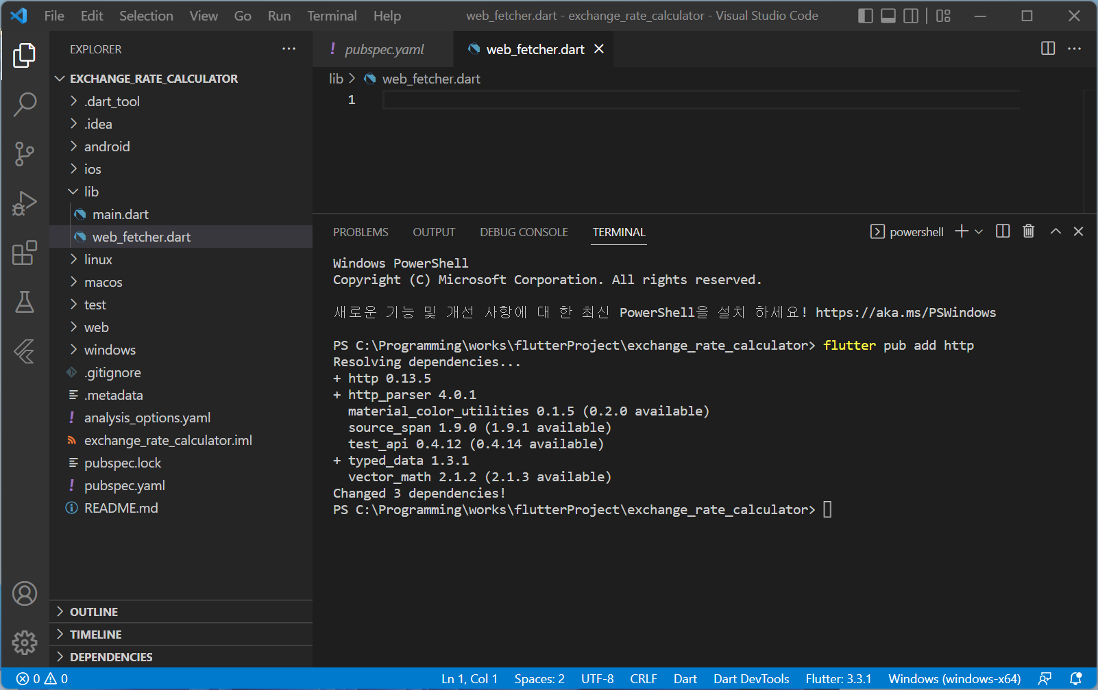 Web에서 정보를 http protocol을 이용해서 읽어오는 작업을 해야하니, http package를 library로 설치해줘야합니다.