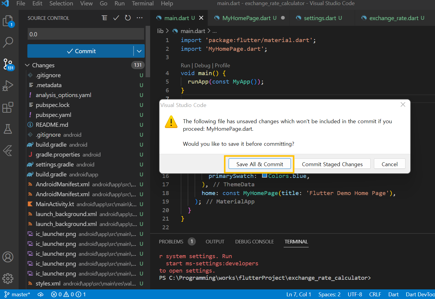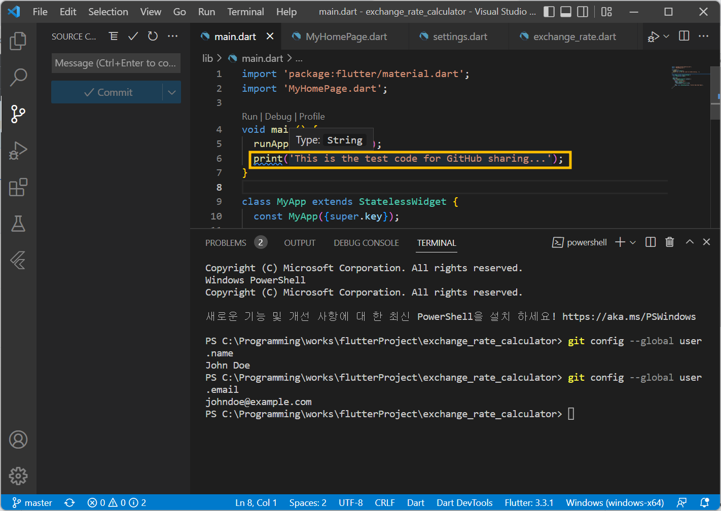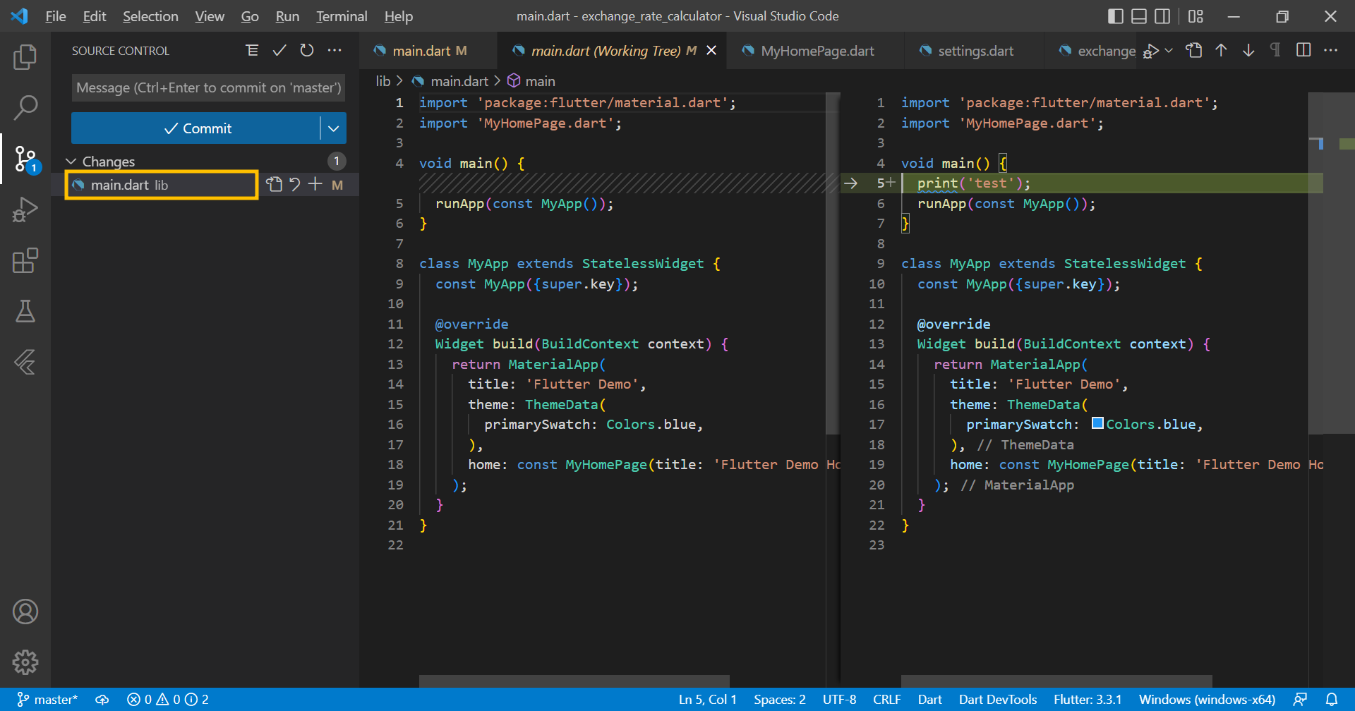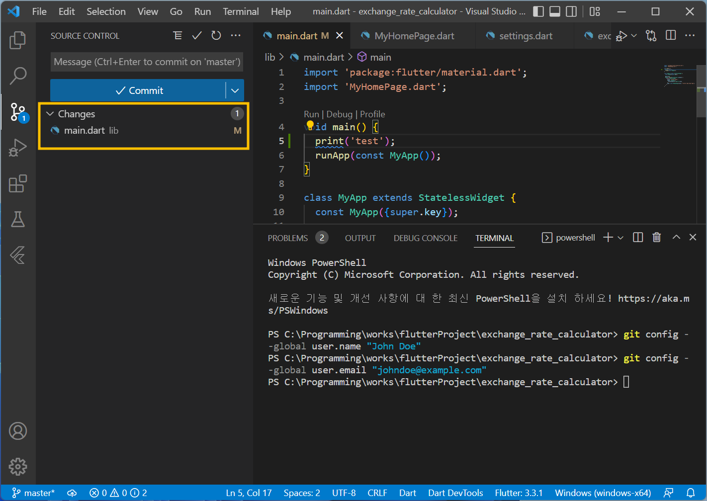 main.dart 파일에 print 문을 하나 추가하고, Ctrl + S를 입력하여 파일을 저장하면 아래와 같이 main.dart가 변경되었다는 표시가 보입니다. 이제 다시 Message 입력 칸에 설명을 적고 Ctrl + Enter를 입력하면 변경이 Local Repository에 저장되는 식입니다.