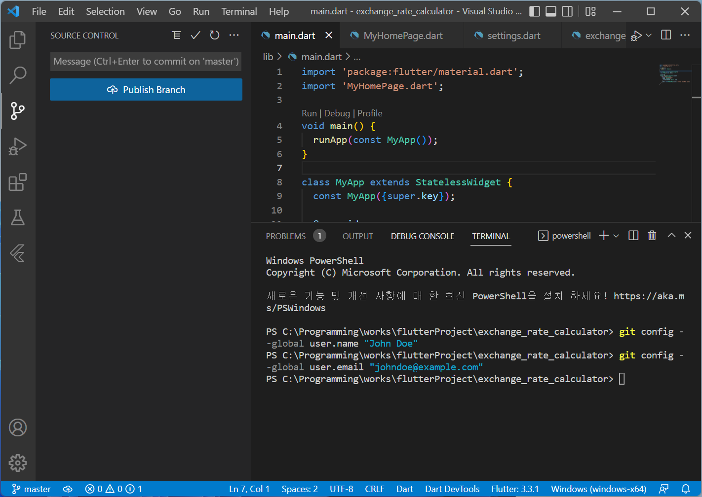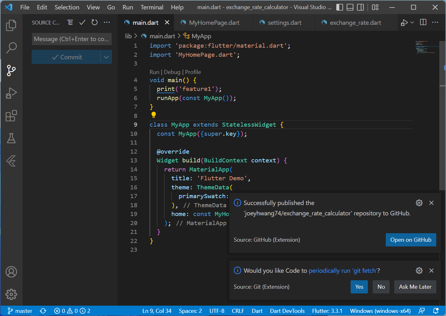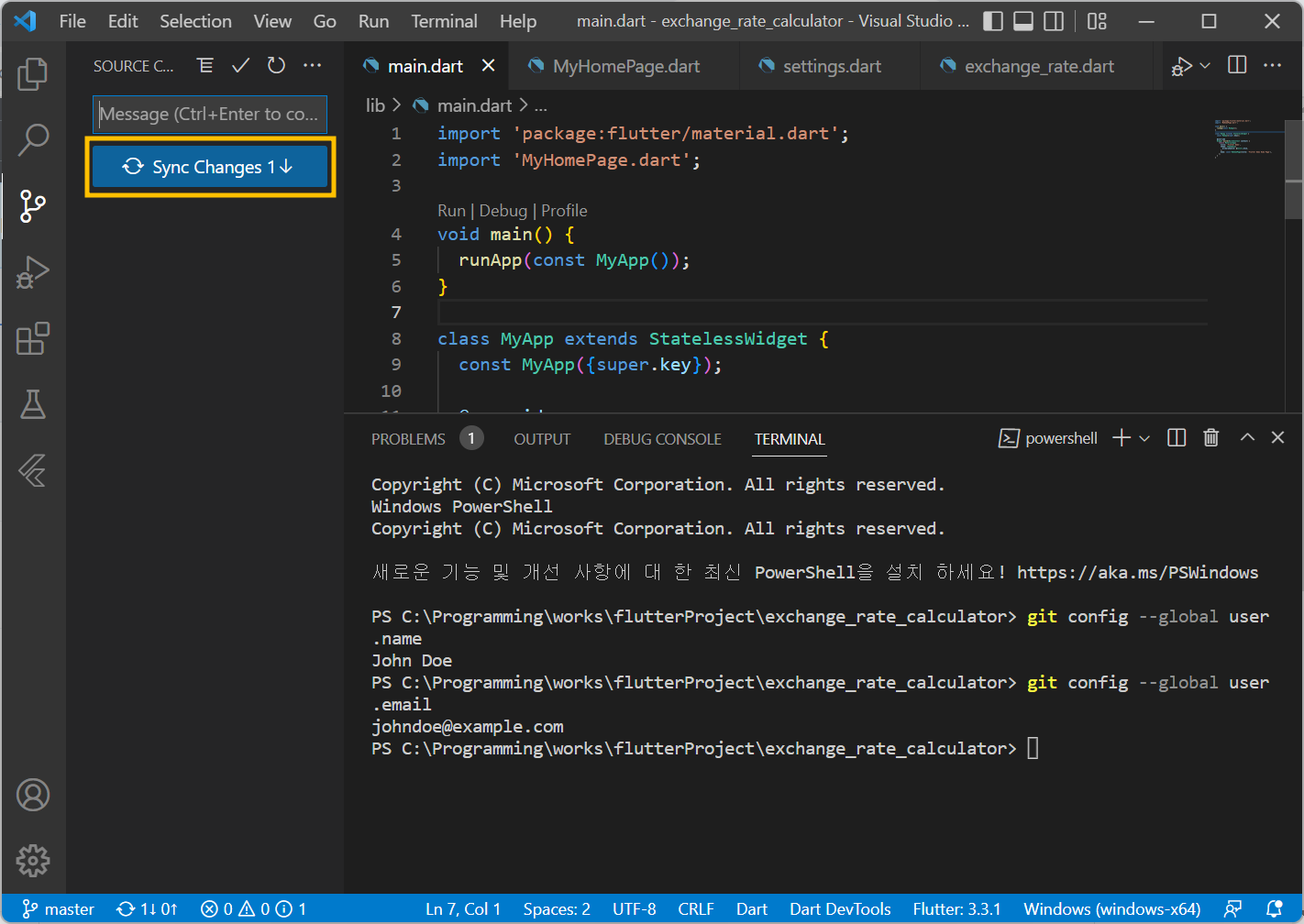 main.dart 파일에 print 문을 하나 추가하고, Ctrl + S를 입력하여 파일을 저장하면 아래와 같이 main.dart가 변경되었다는 표시가 보입니다. 이제 다시 Message 입력 칸에 설명을 적고 Ctrl + Enter를 입력하면 변경이 Local Repository에 저장되는 식입니다.
