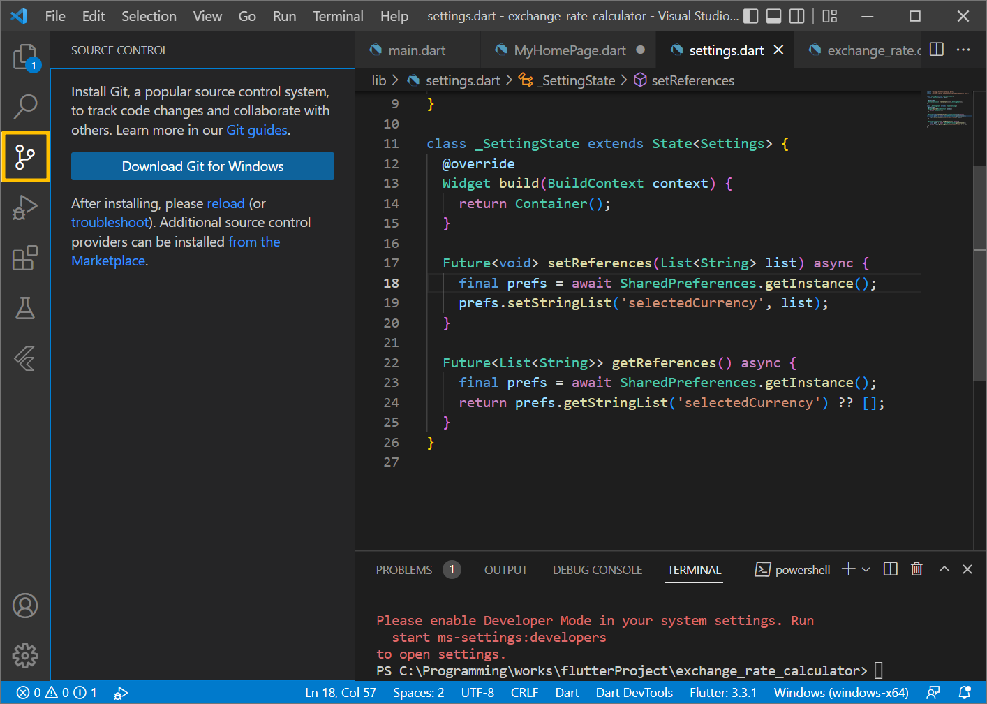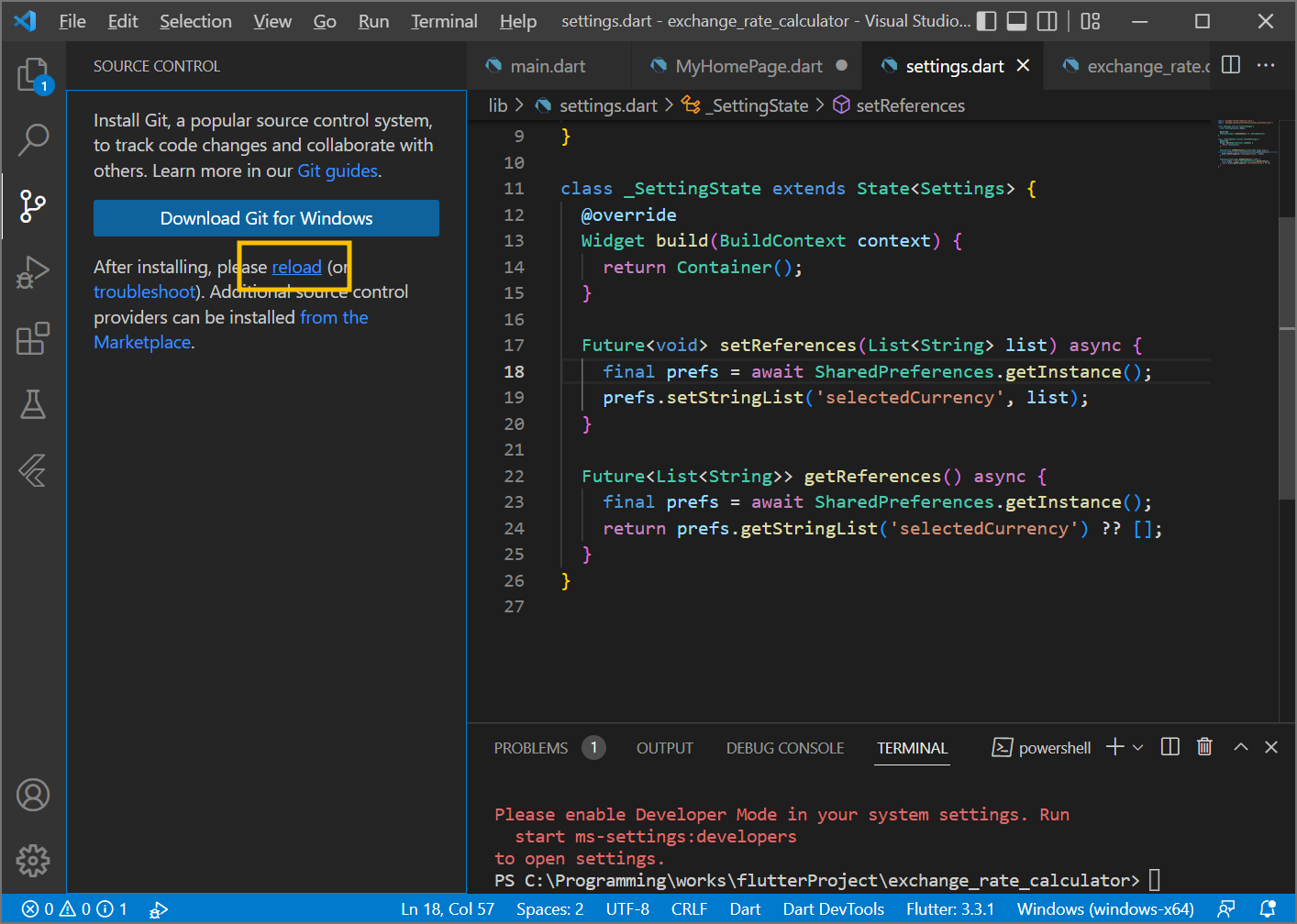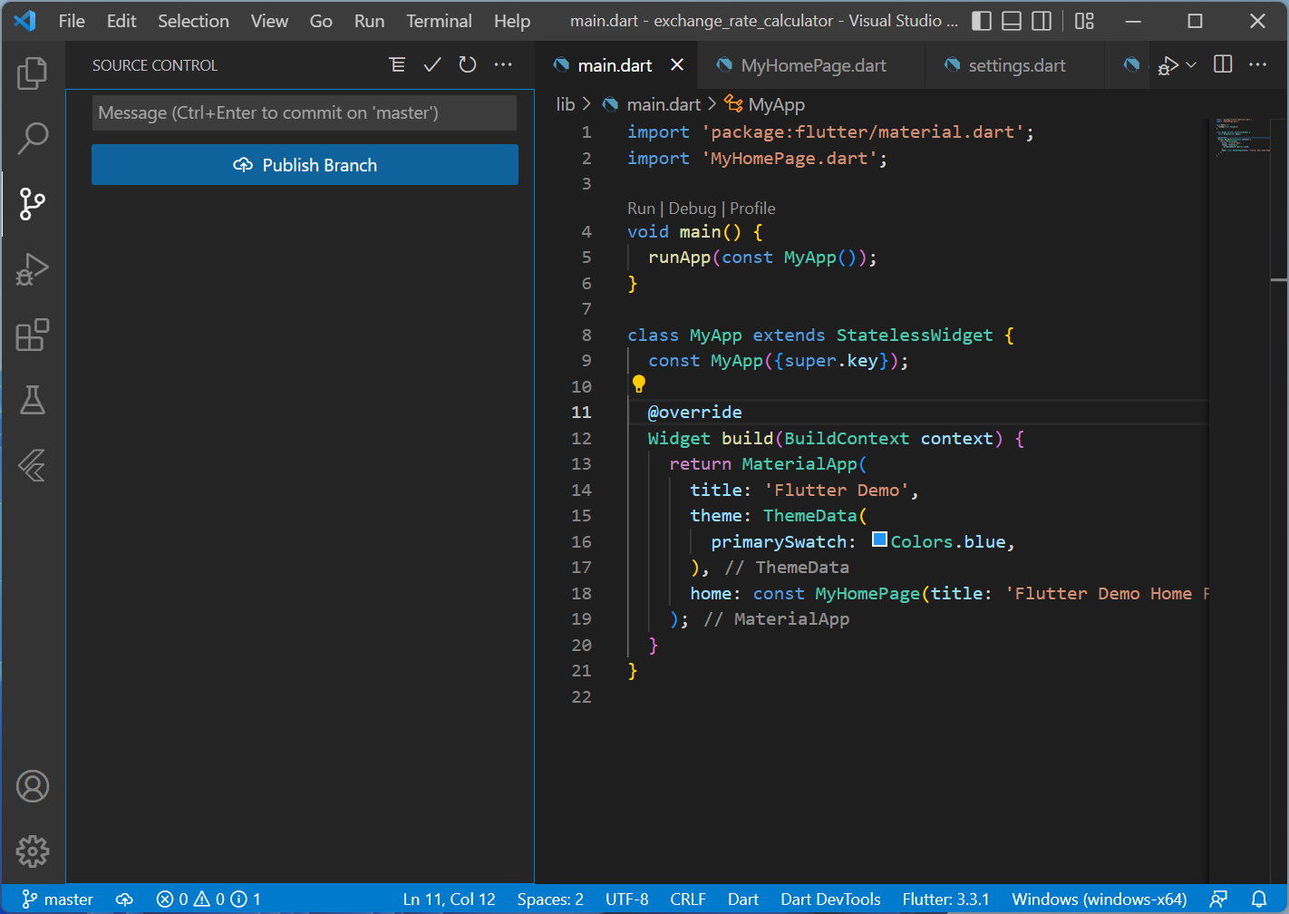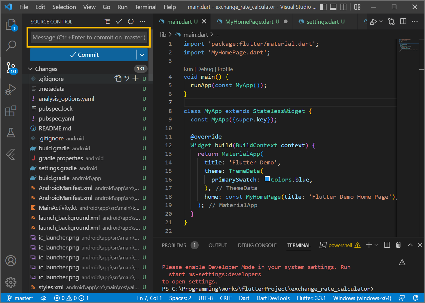 main.dart 파일에 print 문을 하나 추가하고, Ctrl + S를 입력하여 파일을 저장하면 아래와 같이 main.dart가 변경되었다는 표시가 보입니다. 이제 다시 Message 입력 칸에 설명을 적고 Ctrl + Enter를 입력하면 변경이 Local Repository에 저장되는 식입니다.