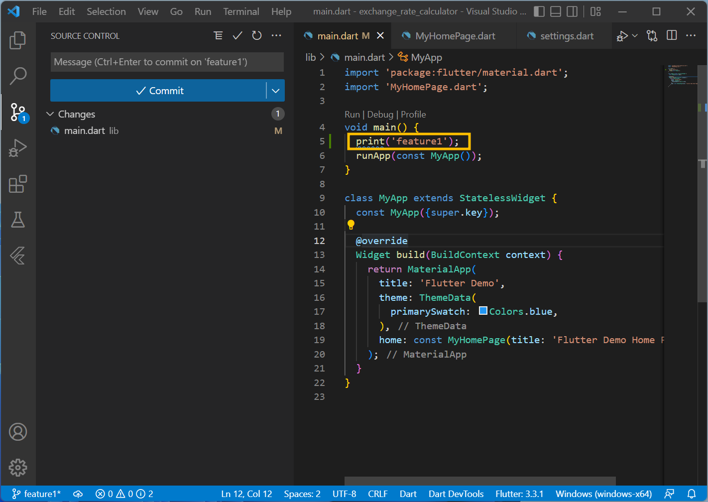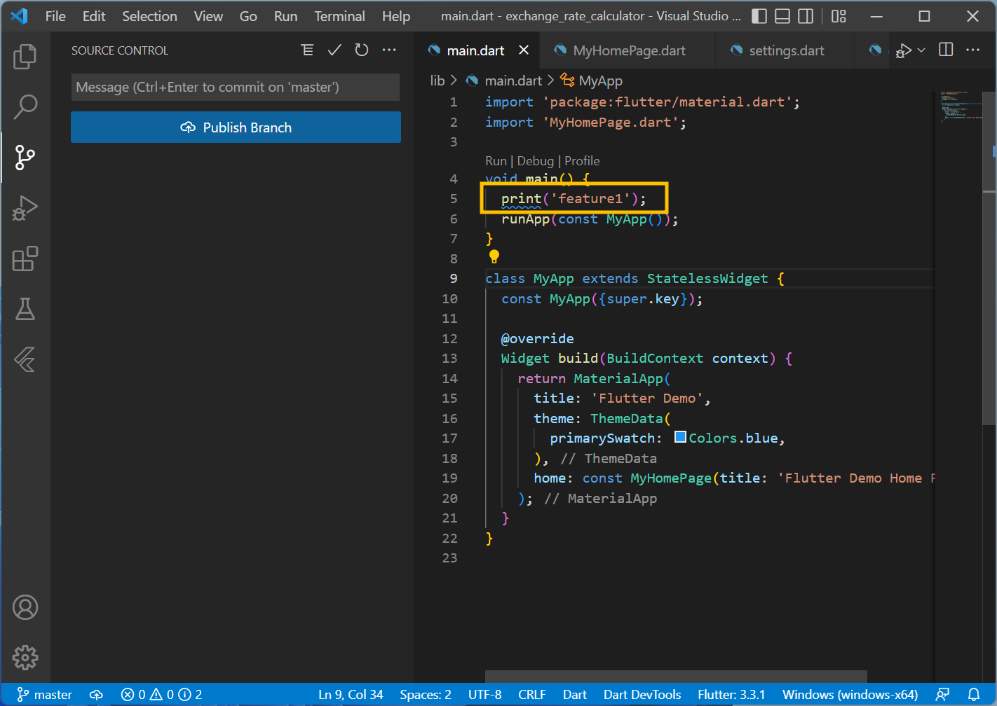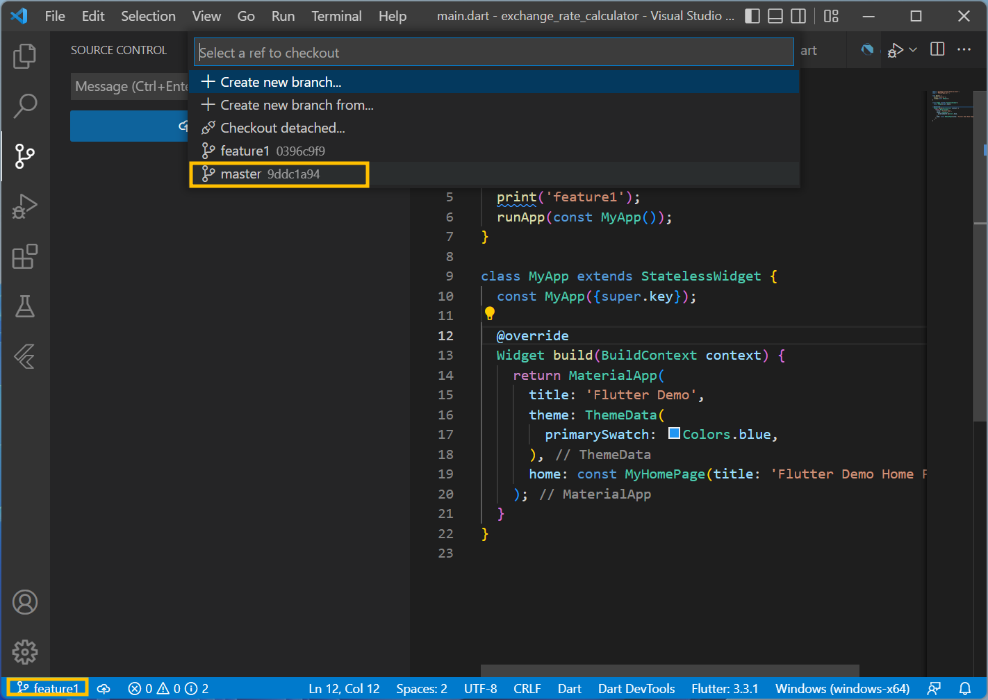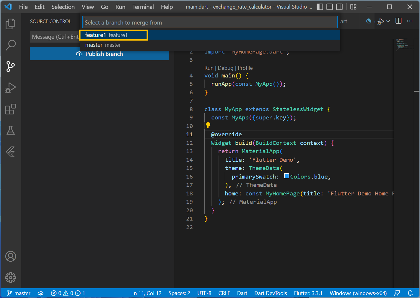이후 입력창에서 feature1을 선택해주면 feature1의 변경사항을 master에 적용하게됩니다. 완료되면 main.dart에 feature1 branch에서 수정한 print문이 추가된 것을 확인하실 수 있습니다.