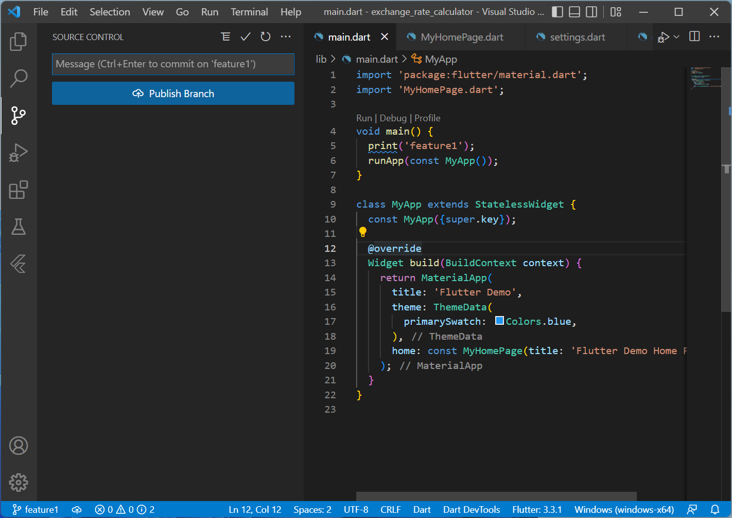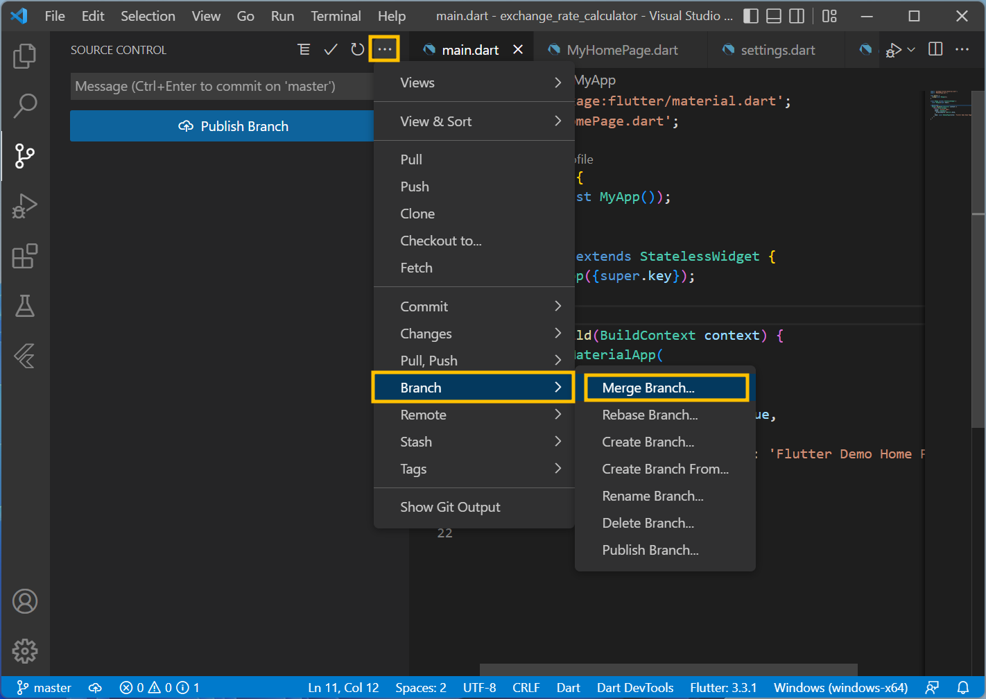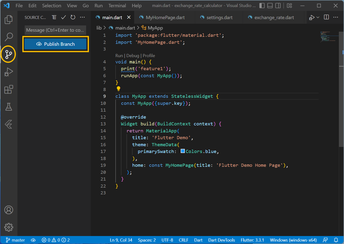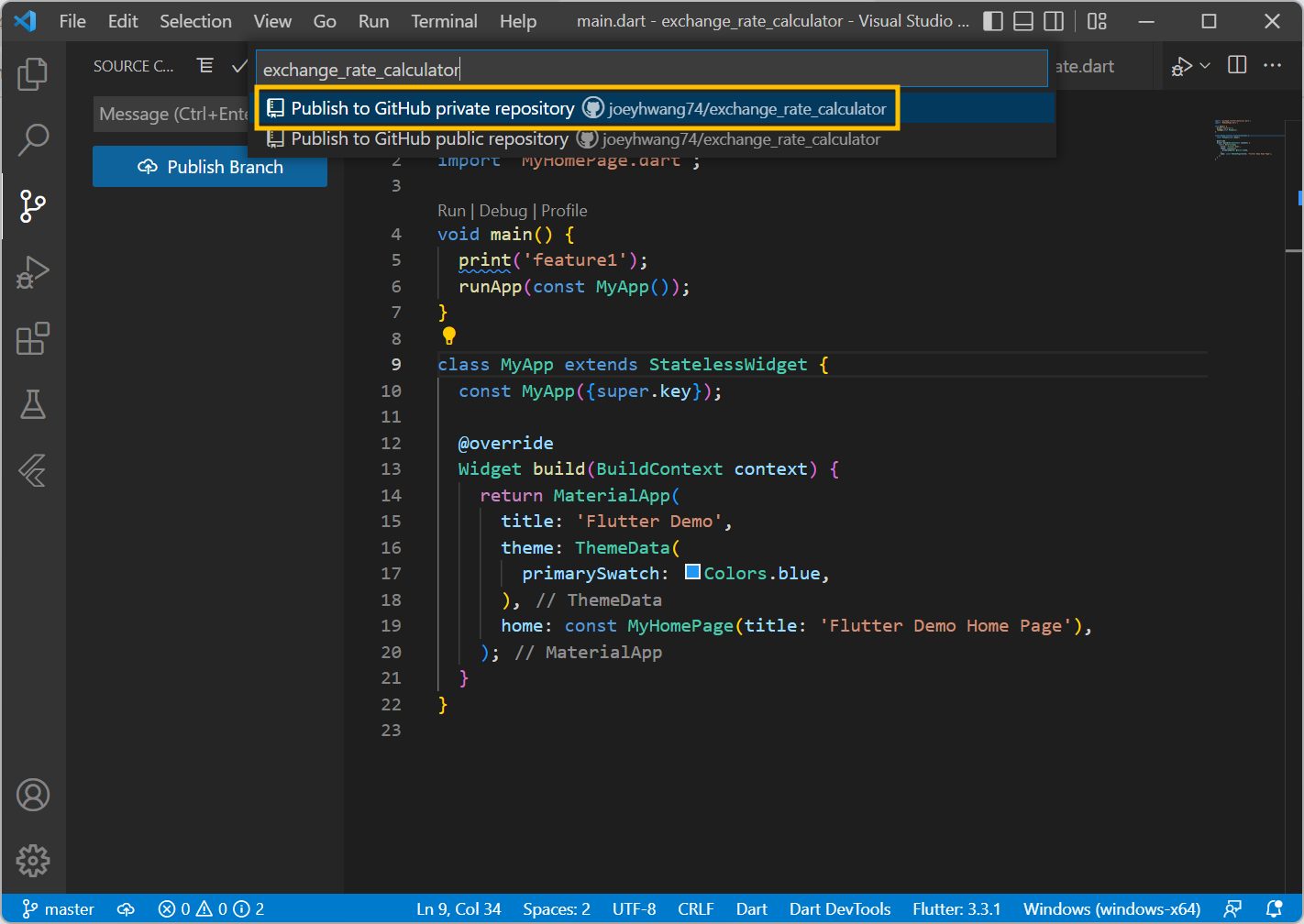 이후 입력창에서 feature1을 선택해주면 feature1의 변경사항을 master에 적용하게됩니다. 완료되면 main.dart에 feature1 branch에서 수정한 print문이 추가된 것을 확인하실 수 있습니다.