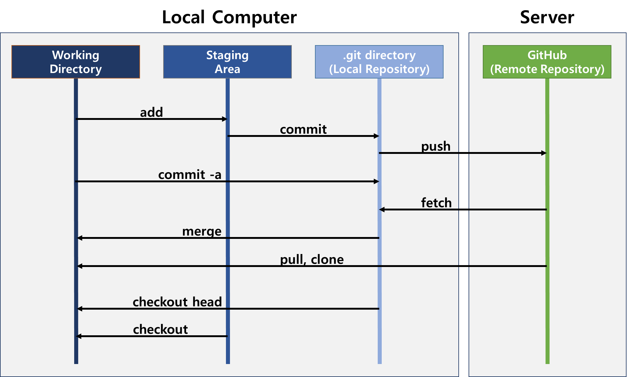 - 먼저, 작업 위치에 따른 Git의 flow를 살펴 보겠습니다.