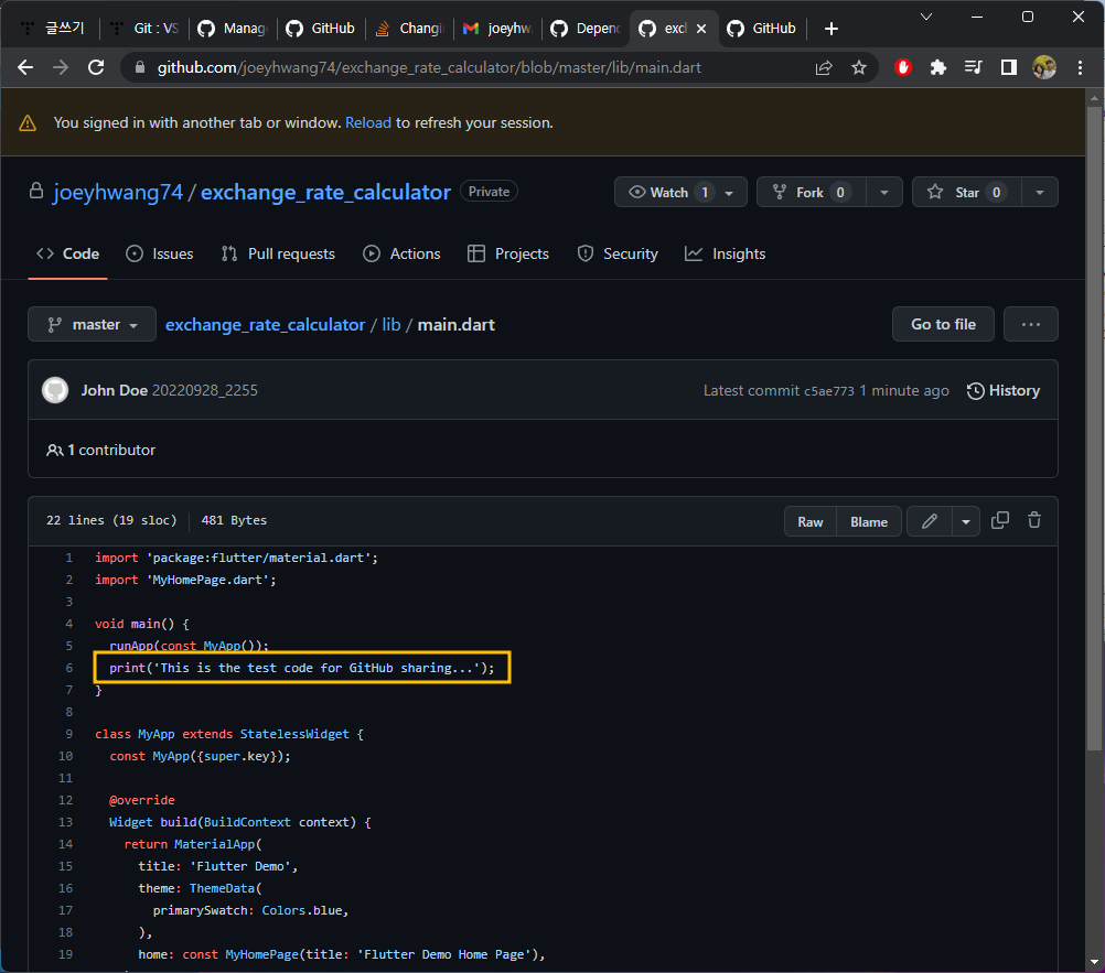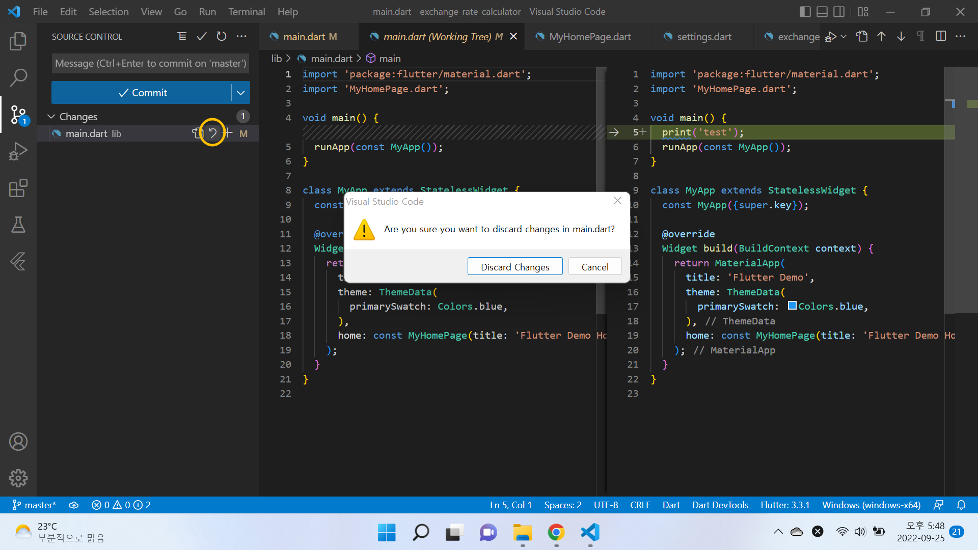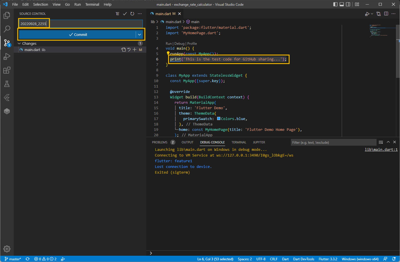 Commit 해보기 전에, 위에 노란 박스 표시된 부분 중 main.dart 파일명을 클릭해봅니다.