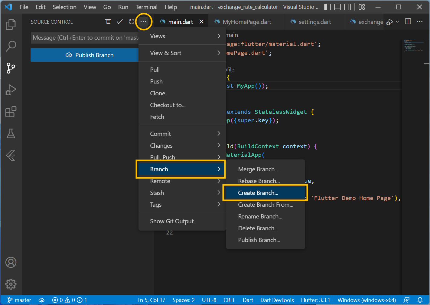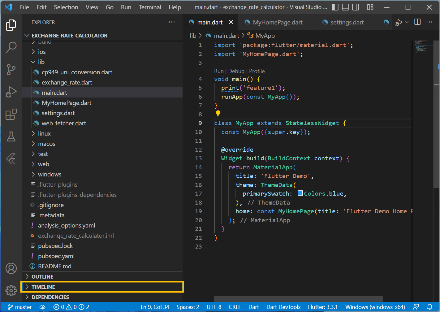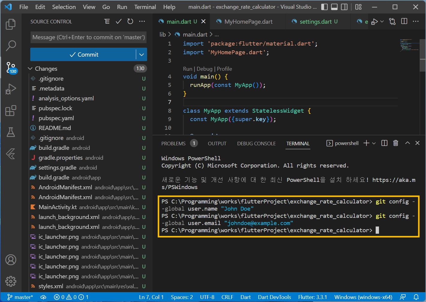 Commit 해보기 전에, 위에 노란 박스 표시된 부분 중 main.dart 파일명을 클릭해봅니다.