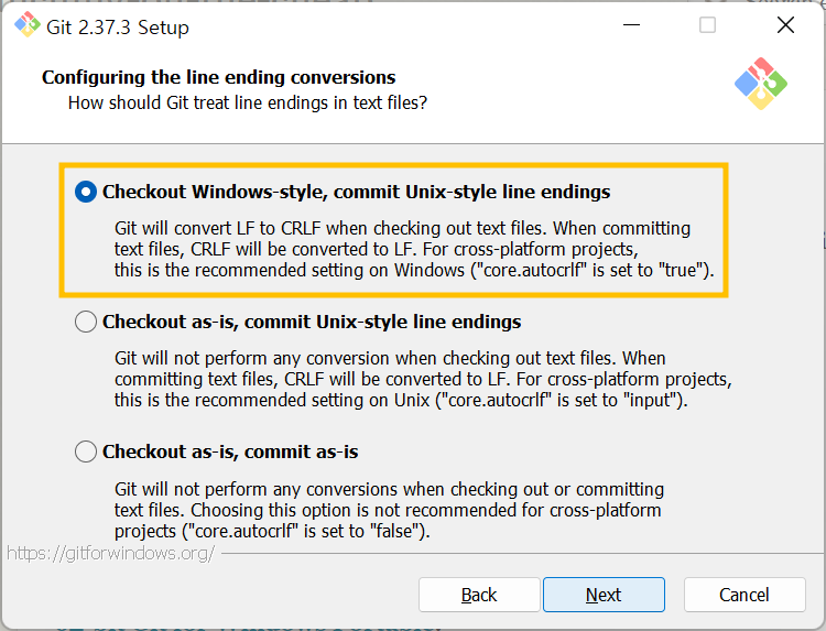Commit(저장소에 업로드)할 때는 Unix 스타일로 자동으로 변환해주도록 선택했습니다.