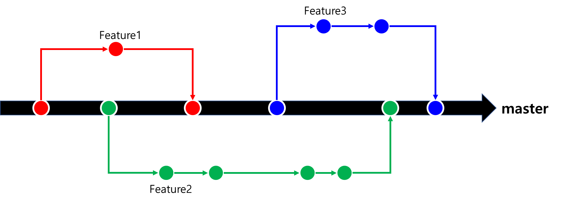 최종적으로 master에 merge를 하기 전까지는 master branch는 그대로 유지되므로, 혹시라도 다른 작업자가 GibHub에서 다운로드해서 Feature2를 작업한다고해도 원 master branch의 코드를 가져와서 작업 가능해집니다. 또 다른 작업자가 Feature3 작업을 위해 feature3 branch를 생성하게되면, Feature1까지 반영이 완료된 master branch를 가져가서 작업하게 되는거죠.