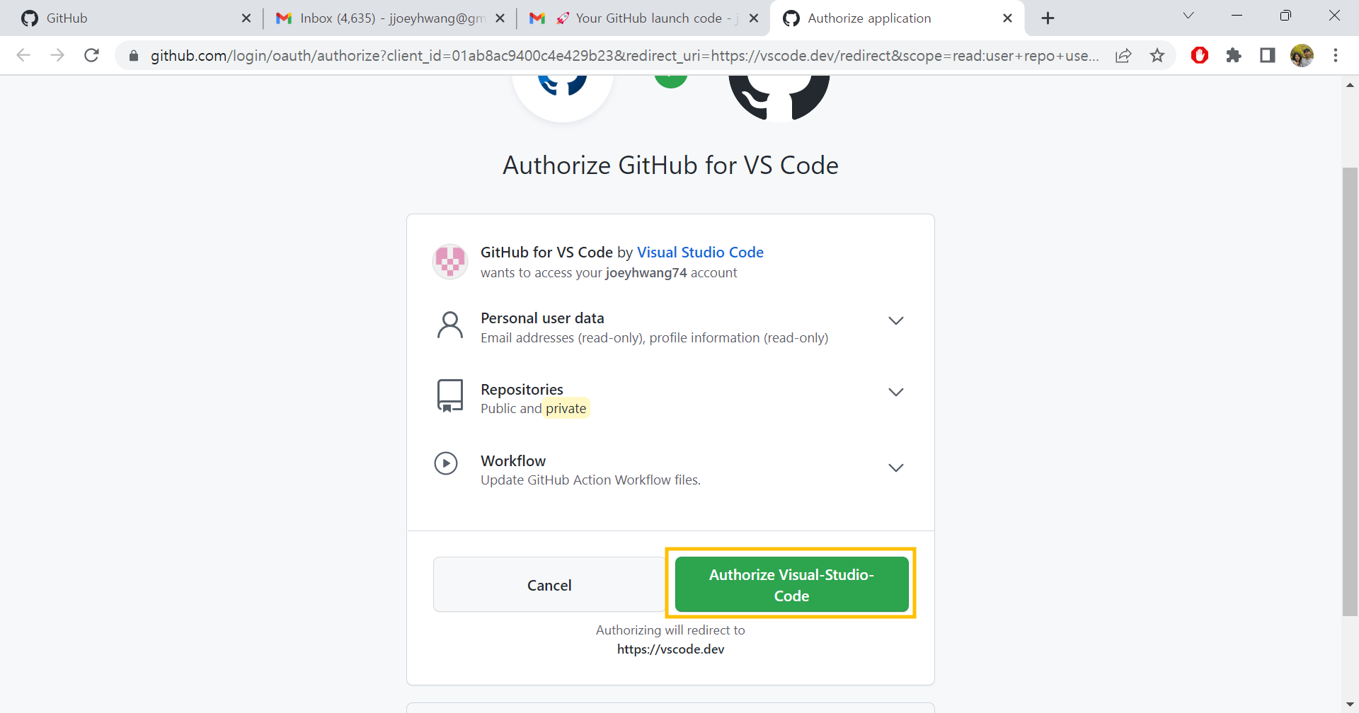 자동으로 GitHub Authorizatin 페이지로 이동하게됩니다. Authorize Visual-Studio-Code 버튼을 클릭해줍니다.