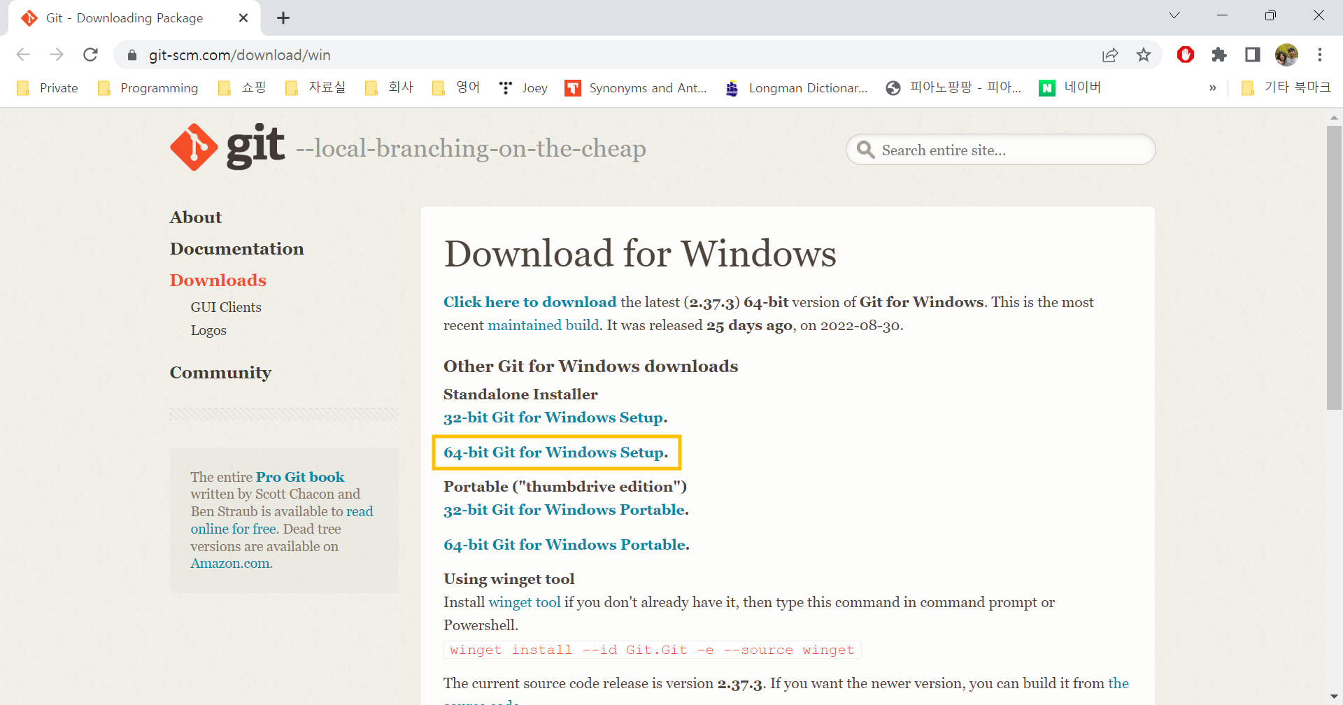 저는 64-bit Windows를 사용 중이므로, 64-bit Git for Windows Setup 을 클릭해서