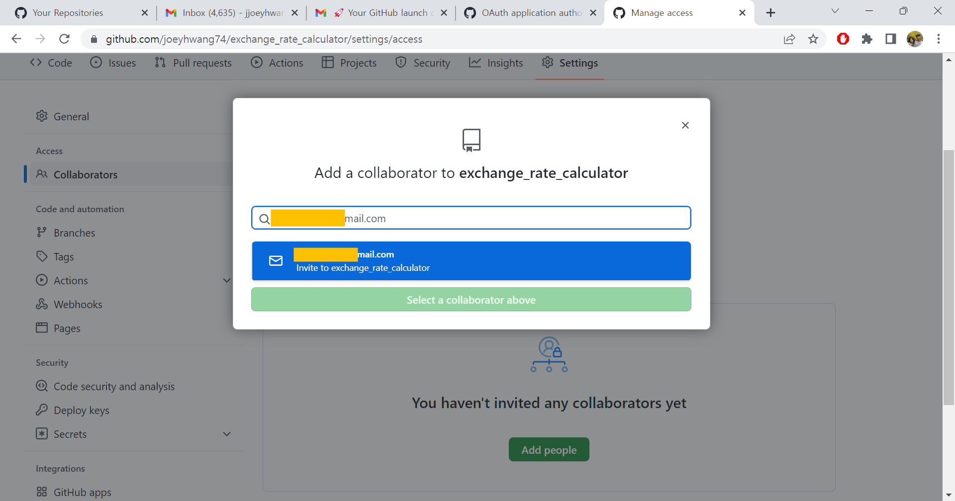 추가하고자하는 사용자의 email 주소를 입력하고, 사용자를 클릭한 후에 "Select a collaborator above" 를 클릭해줍니다.