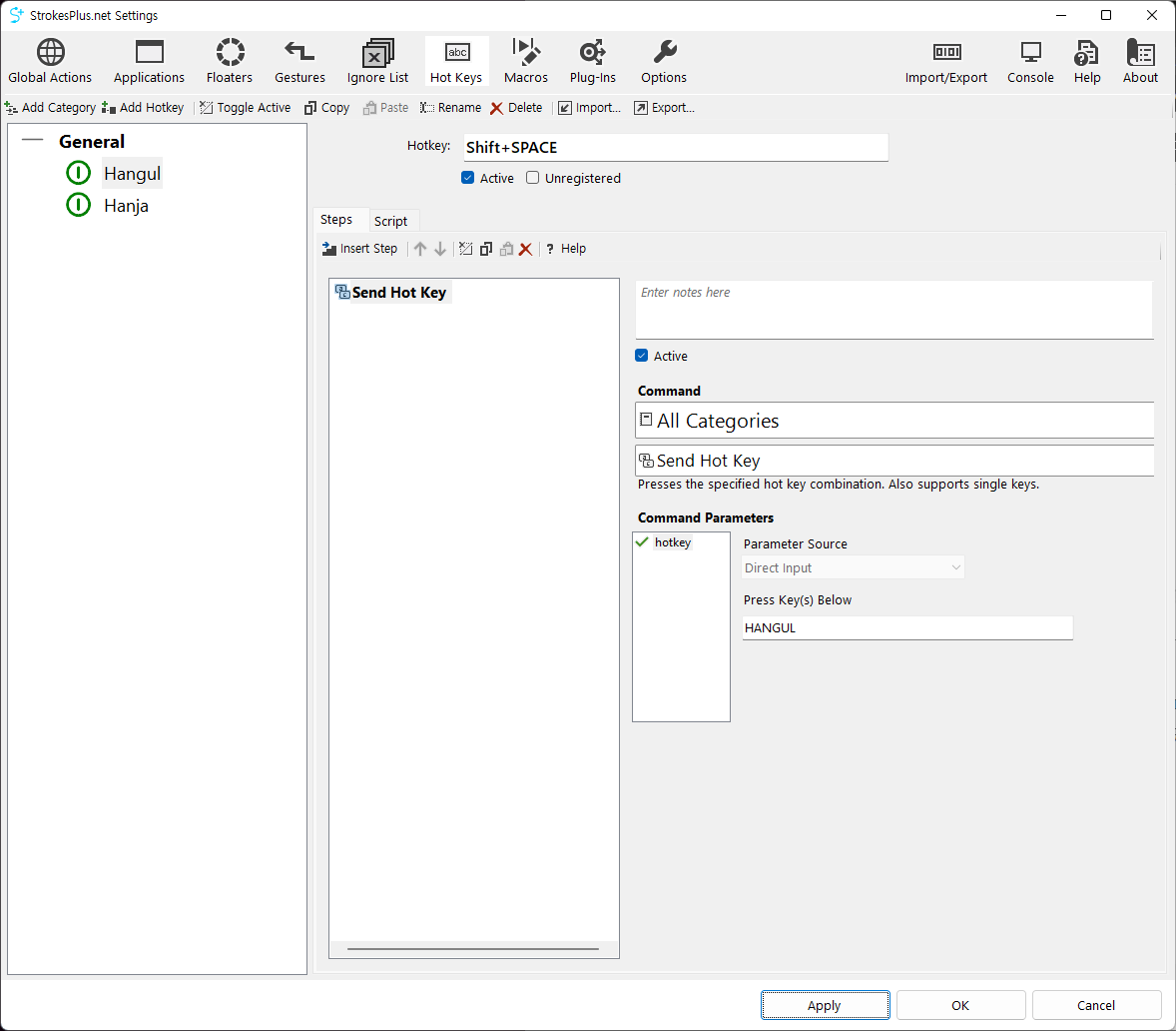 특정 키 입력을 다른 Hotkey나 기능에 할당할 수 있습니다. 저의 경우는 Shift + Space 와 Ctrl + Space에 각각 한글키, 한자키를 할당해 두었습니다.
