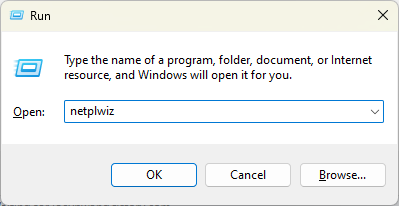 이제 설정창은 닫아주시고, Win키+R을 입력해서 Run 프롬프트를 열고, netplwiz를 실행시킵니다.
