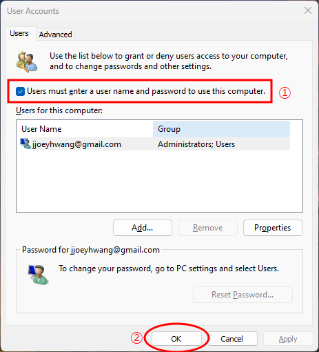 아래와 같이 User Accounts 세팅 화면이 뜨면, 빨간 박스 표시된 부분의 체크를 해제 후 OK 버튼을 눌러줍니다.
