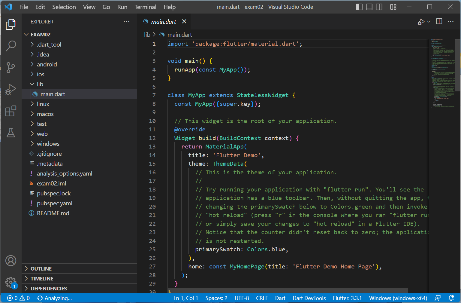 좌측의 Side Bar에 보면 main.dart 가 선택되어있고, 우측의 Editor 창에 main.dart의 내용이 보입니다.
