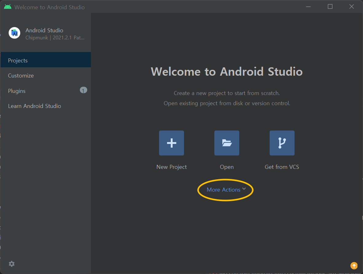 Android Studio를 실행합니다. (윈도우키 누르시고 android studio 를 검색하시면 됩니다.)