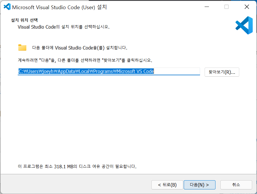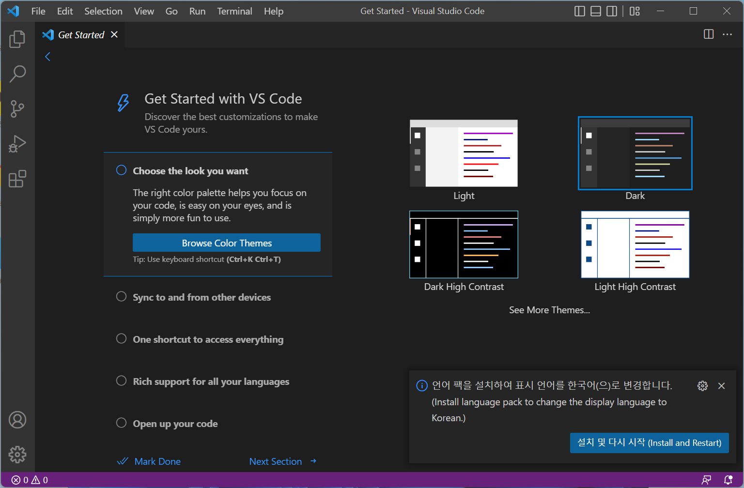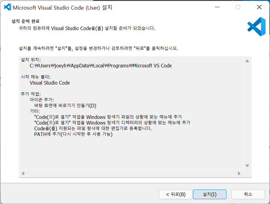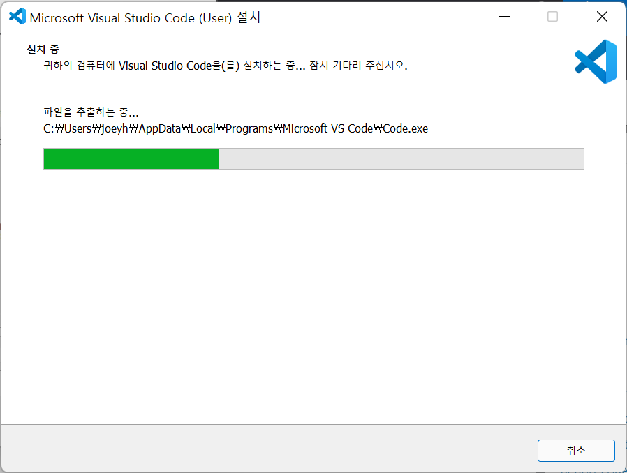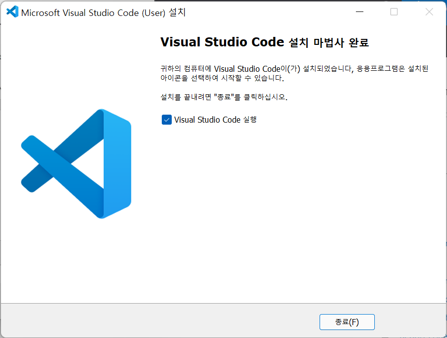 설치가 완료되면 자동으로 VS Code가 실행됩니다. 실행되지않으면, 바탕화면 아이콘으로 실행할 수 있습니다.
