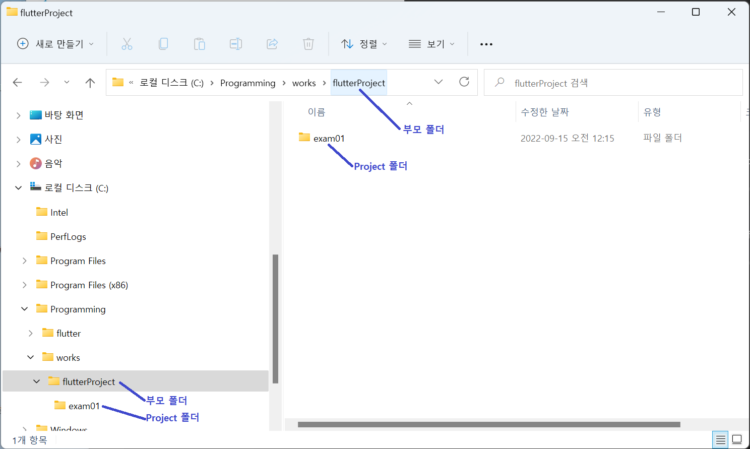 아래의 폴더 구조를 보면, 부모 폴더 아래 Project 폴더가 위치합니다.