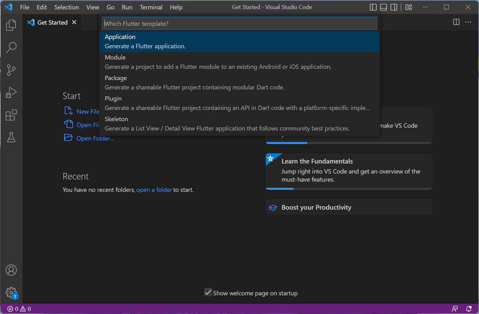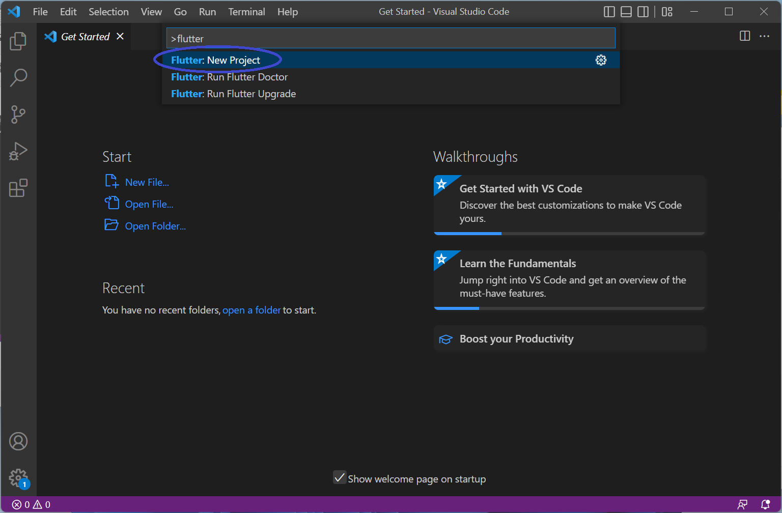 Flutter extention이 설치되어있으므로, 관련 support command들도 이미 설치가 되어있을겁니다.