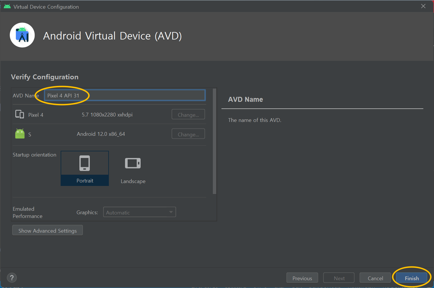 AVD Name을 기억해둡시다. Finish 클릭하면 끝납니다. 이제 Virtual Device Manager와 Android Studio는 종료해주세요.