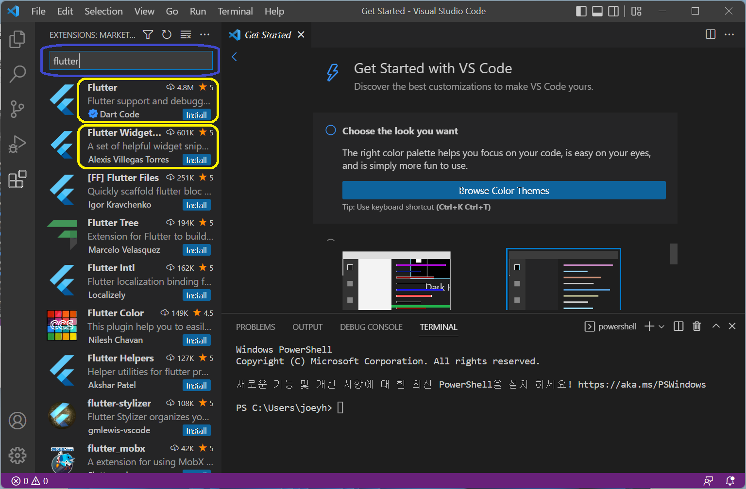 아래와 같이 검색창에 flutter를 입력하면 flutter 관련 extention 들이 검색됩니다.