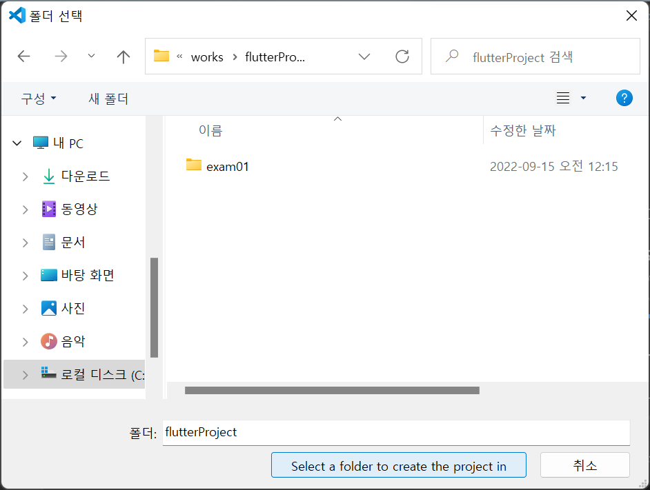 ④ "부모 폴더"의 위치를 물어봅니다. 저의 경우는 c:\Programming\works\flutterProject\ 로 선택했습니다.