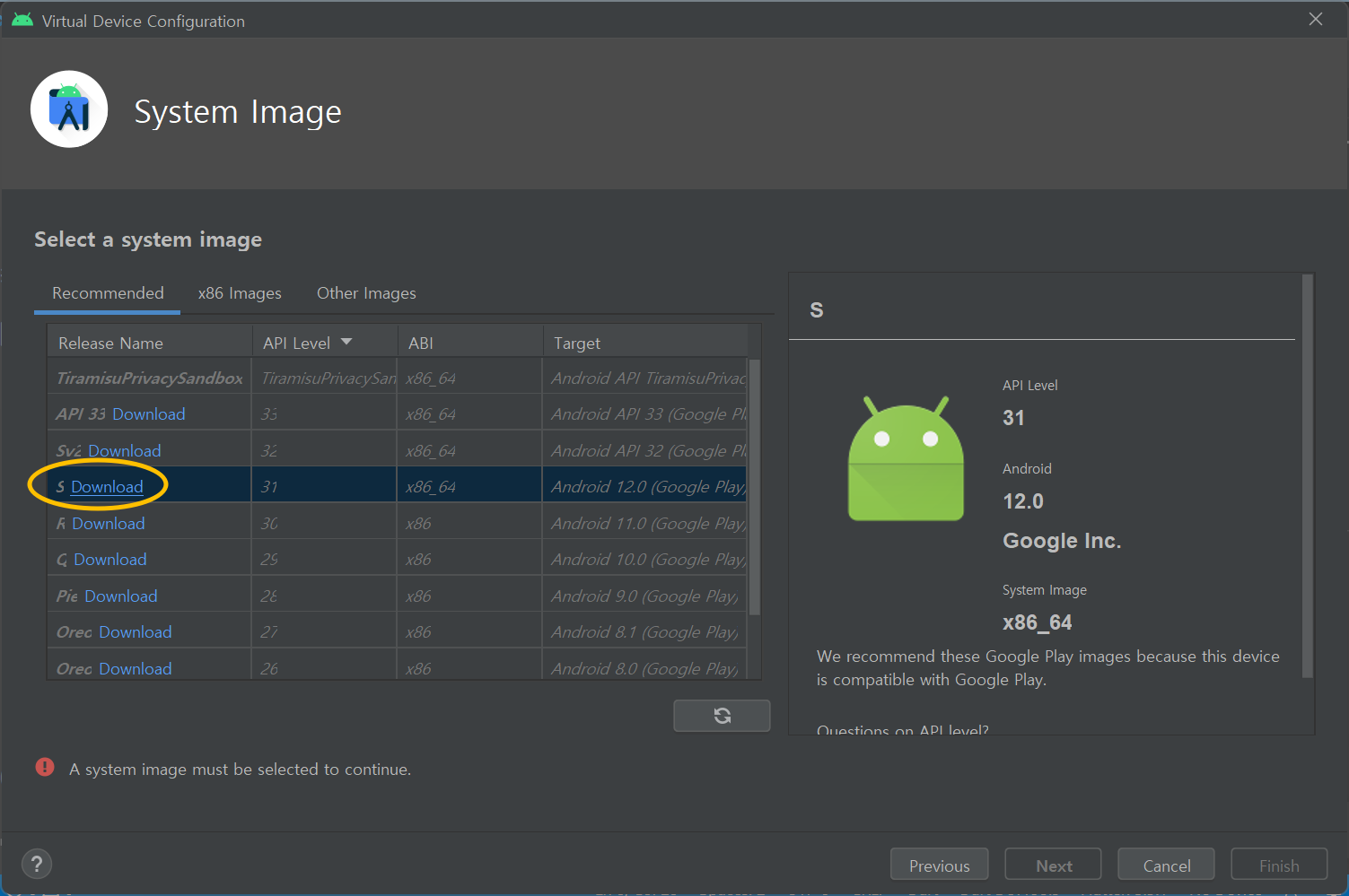 처음 Emulator를 만드는 과정이라 Android Image가 Download되어있지않습니다.