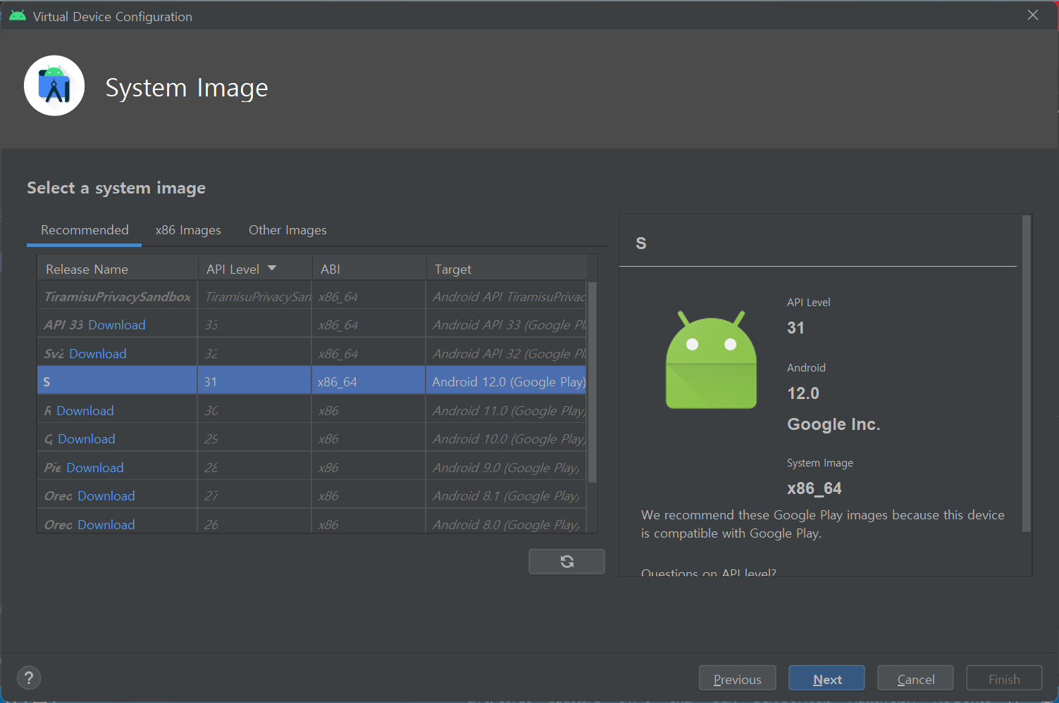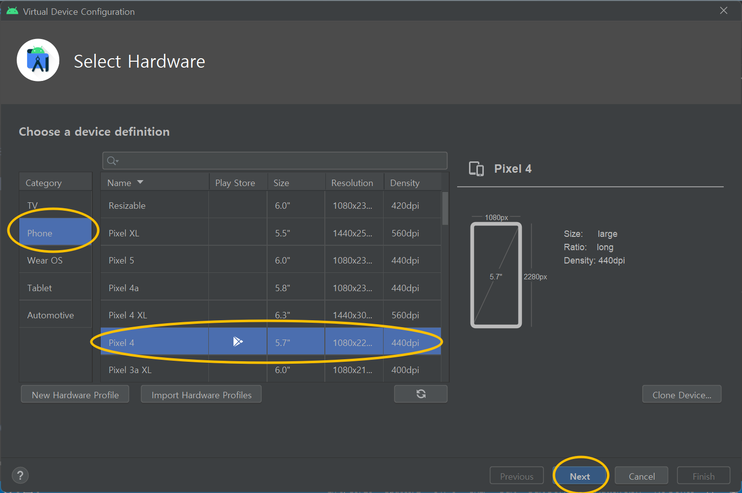 저의 경우 Pixel 4를 emulator로 선택했는데, 이유는 한가지 Play Store 지원 때문입니다.