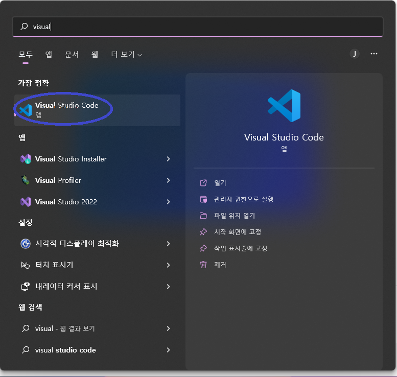 ② 윈도우키 입력 후, visual studio를 검색해서 실행