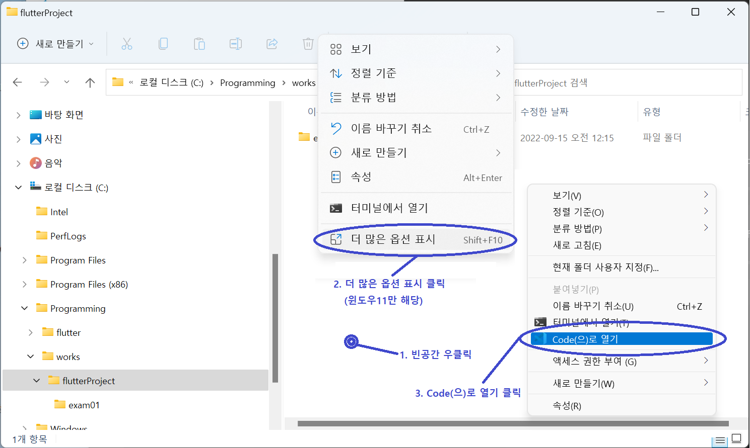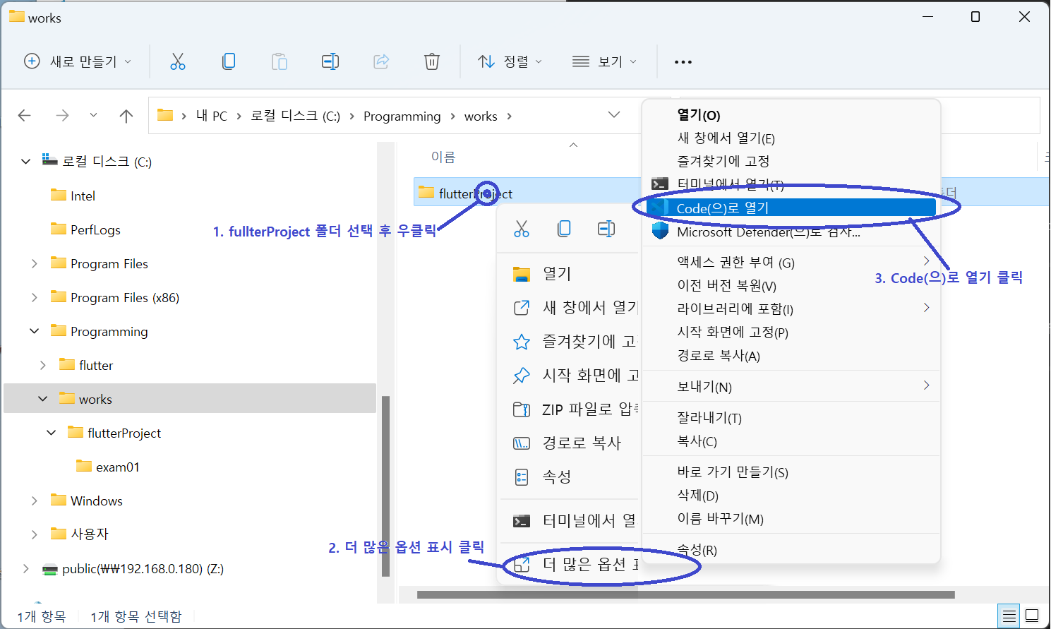 VS code가 열릴 때 작업 폴더가 현재 선택한 폴더(C:\Programming\works\flutterProject)인 상태로 실행됩니다.