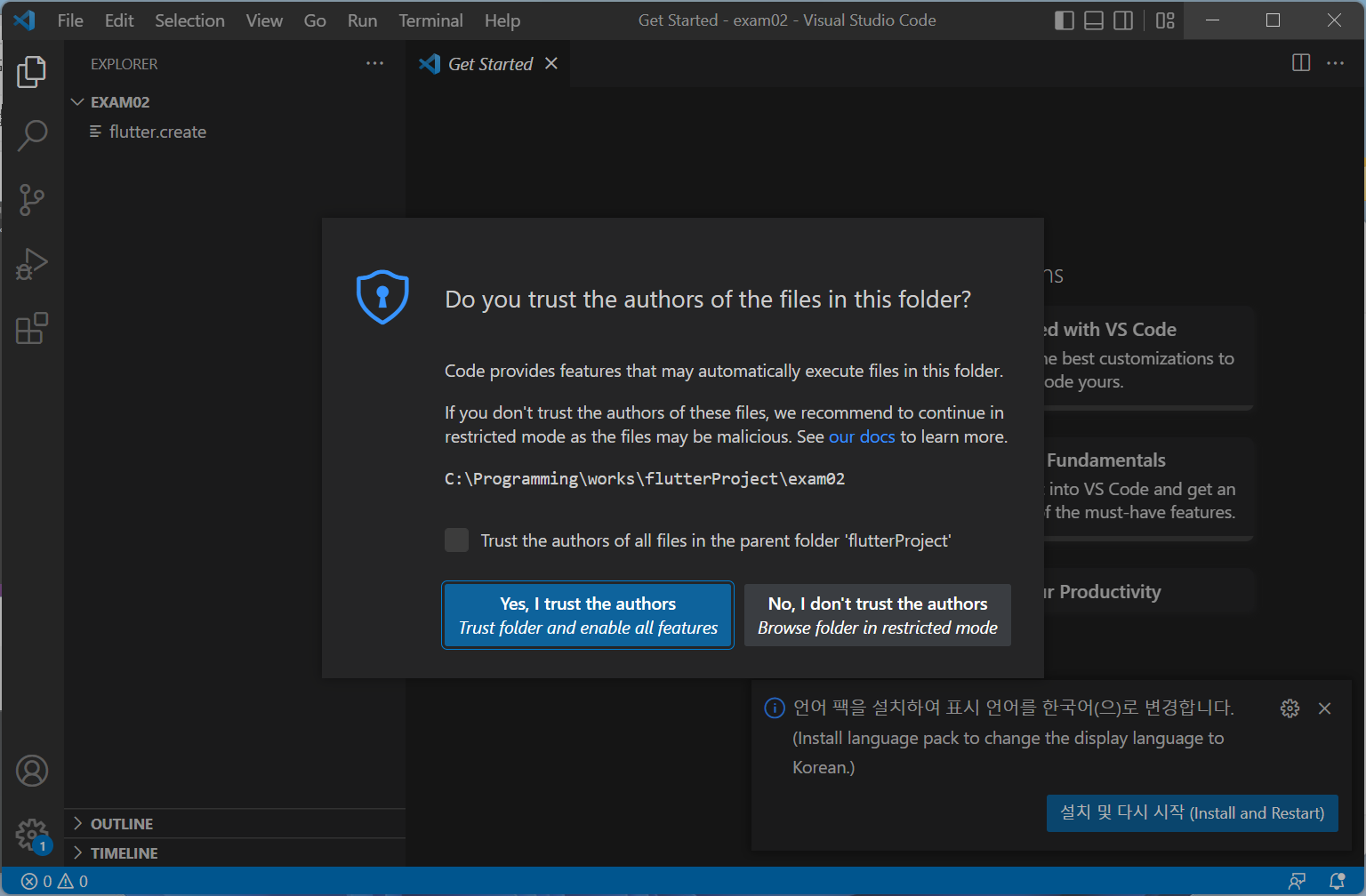 ⑥ 부모 폴더에 처음으로 Project를 생성하는 경우 믿을 수 있는 폴더인지 물어봅니다. 믿어봅니다.