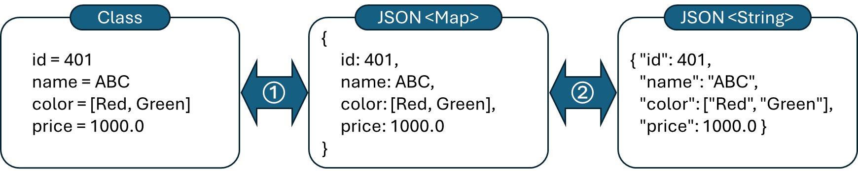 The Dart language provides a library for jsonEncode and jsonDecode.