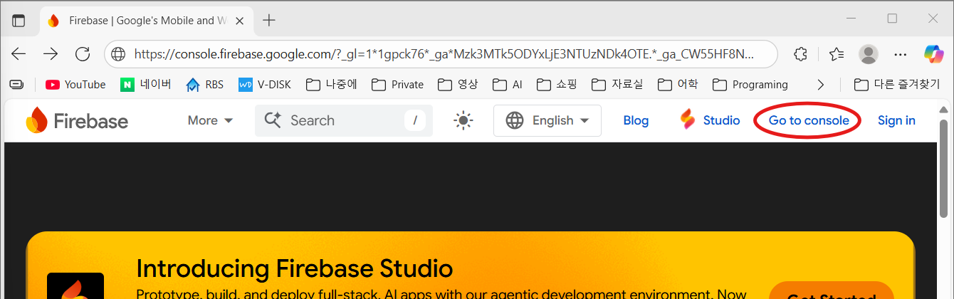 Firebase homepage로 이동해서 상단 Menu bar의 오른쪽에 "Go to console" 메뉴를 클릭합니다.