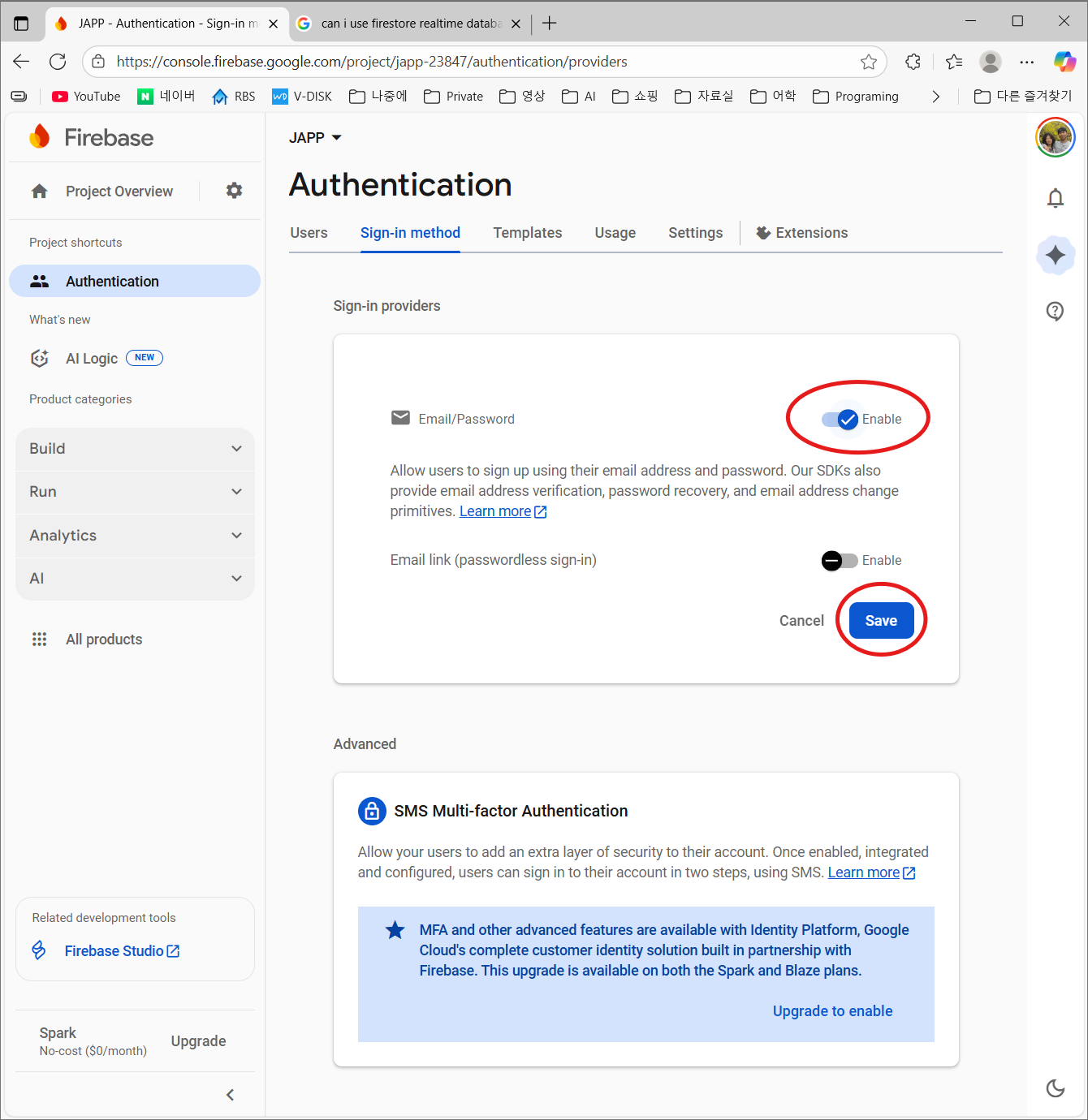 먼저 Email/Password 버튼을 클릭합니다.