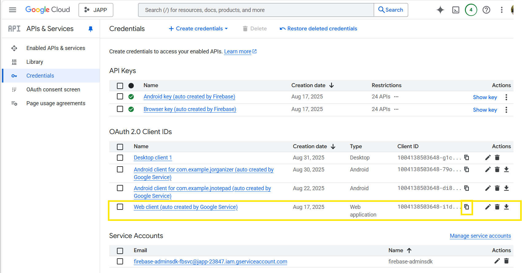 그 중 Web client (auto created by Google Service) 리스트의 Client ID 부분에 복사 버튼을 누르시면 됩니다.
