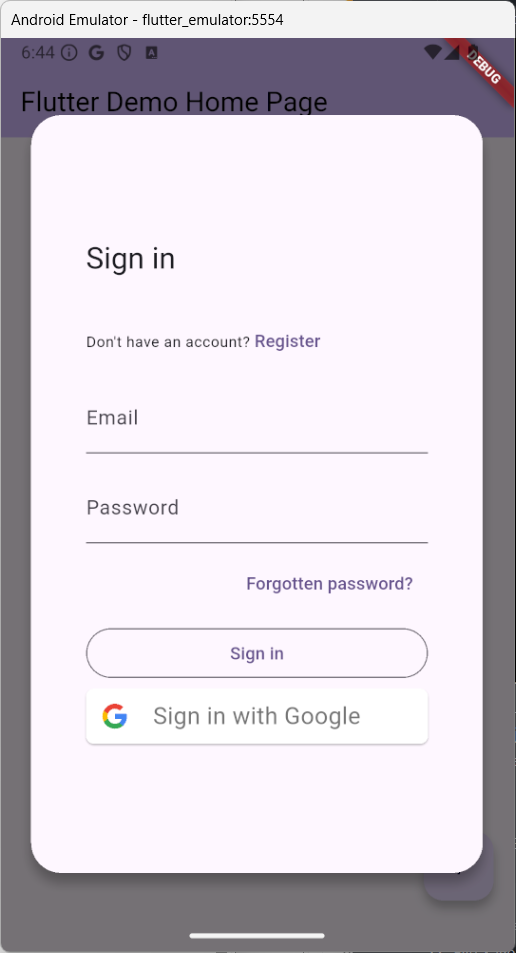 실제 동작은 아래와 같습니다. 첫화면에서 floating button을 누르면 Sign-in dialog를 띄웁니다. Sign in에 성공하면 Log in 중이라는 메세지와 함께 Sign out 버튼을 보여줍니다. 이때 Dialog 외부를 터치하면 Dialog는 닫힙니다.